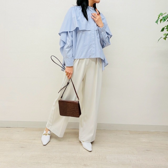 身頃から袖にかけて流れるように広がるラッフルが華やかな印象のブラウス