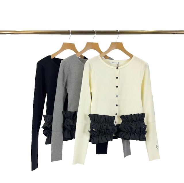 ウエスト部分にあしらわれたグログランフリルが印象的なリブカーディガン