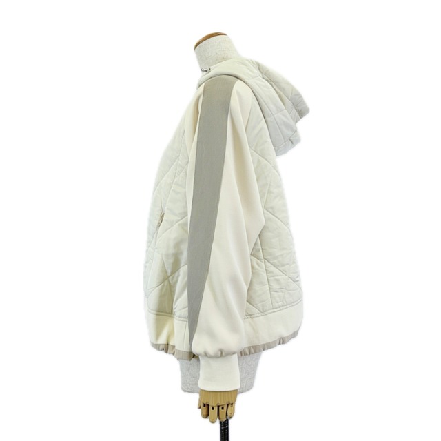 身頃は軽量中綿入りのダイヤキルティング、袖は柔らかなダンボール素材、裾と袖口にはニットリブを組み合わせた異素材ミックスブルゾン