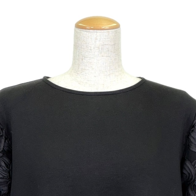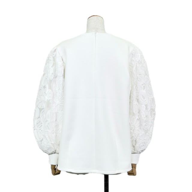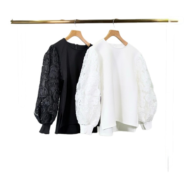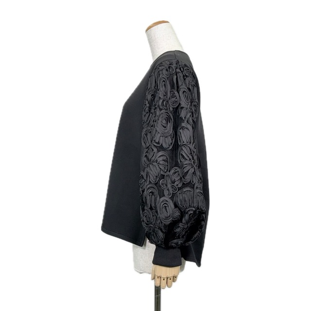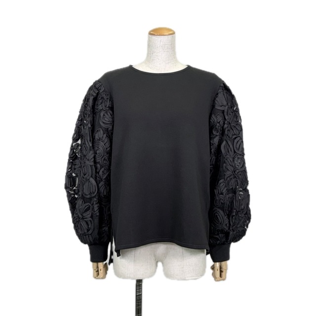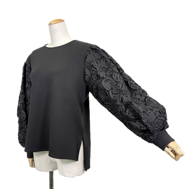 立体感のあるフラワーモチーフのチュールレースを袖に重ねた、華やかさと実用性を兼ね備えた裏起毛プルオーバー