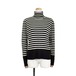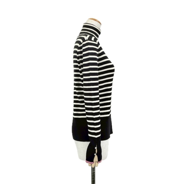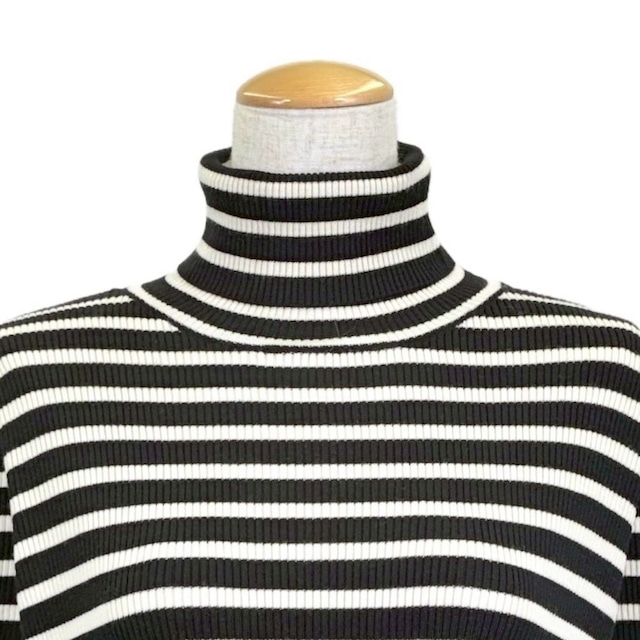 細ピッチのボーダー柄が大人カジュアルに映える、タートルネックリブニットプルオーバー